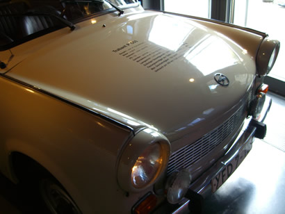 旧東ドイツ市民の暮らしや日用品などが展示されていて、手に取ってみることも可能。再現された居間や台所はレトロな感じ(テレビは当時のニュースが流れていました)。一時期有名になったトラバントも展示。トラバントって本当にしょぼい車です